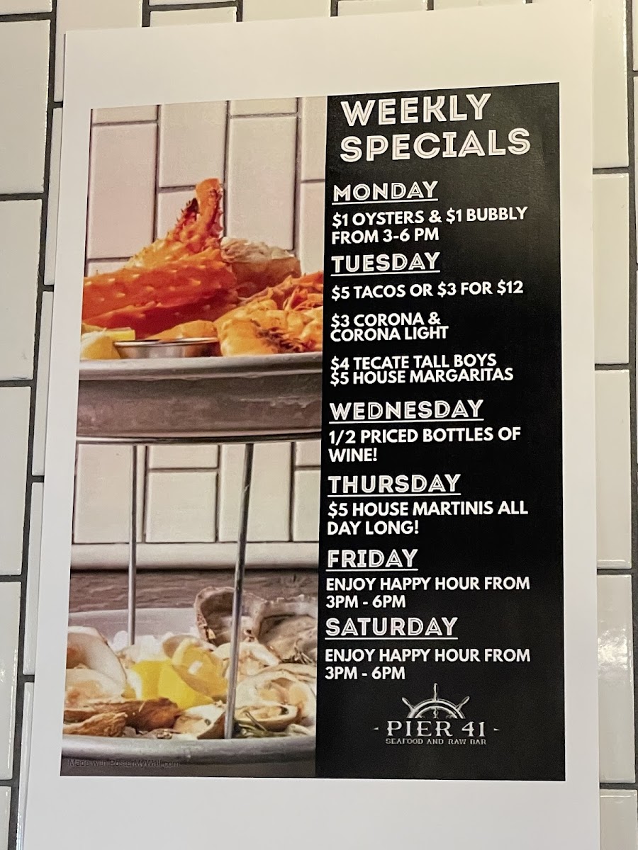 Welcome to Pier 41, a quaint gem nestled in Mt. Pleasant, SC, that promises a delightful seafood experience. Their menu showcases a tantalizing selection of dishes designed to elevate your culinary journey.